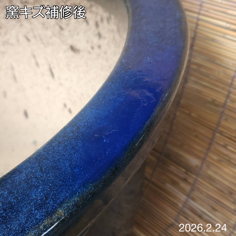 | 特徴 | 下記、別記参照 (1) 昭和時代後期の作。 (2) 本格的な釉薬の二度掛けの作です。 (3) 当時、大量に生産された中で、窯キズがみられ、規格外のB級品扱いとなり出荷は見送られていました。 (4) 窯キズありのB級品ではありますが、良き時代の職人芸の最高級品質の輪型植木鉢が窯元に残されていました。 (5) B級品であるところから窯キズは修理出来るところは修理し、安価にご提供させていただきました。(2019年07月17日) |