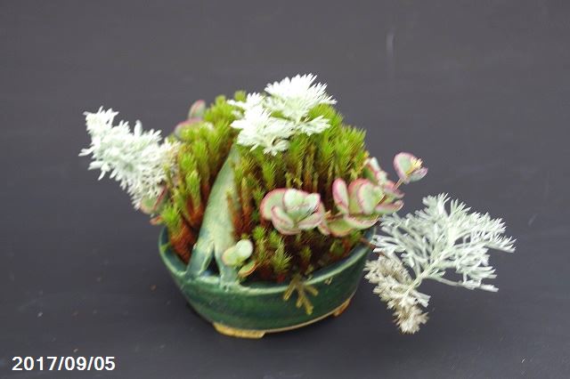 【現品】 越前芳水作寄せ植え 緑釉持ち手付変型鉢(10cm) アサギリソウ アポイミセバヤ スギゴケ 【No.6952】【寄せ植え・小山飾り】【苔盆栽・草盆栽】【山野草展・盆栽展】